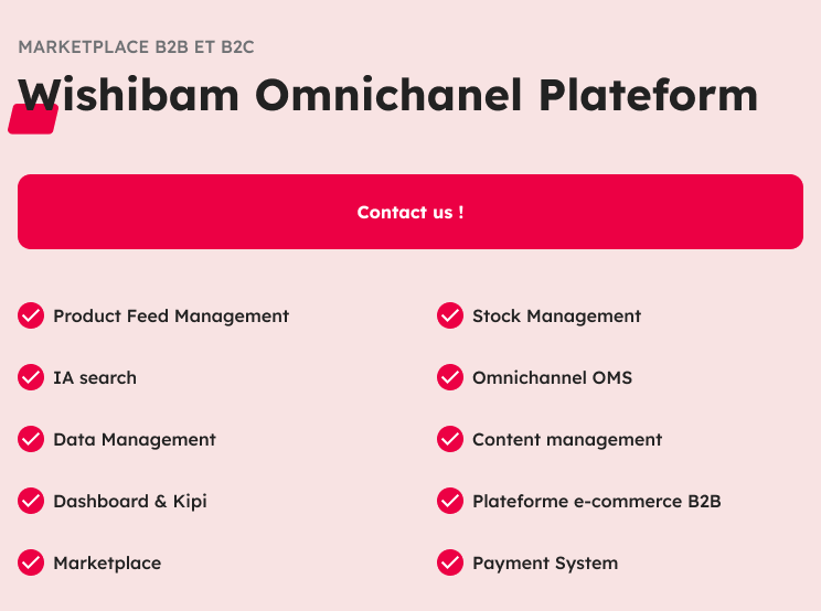 Wishibam propose une plateforme SaaS dédiée aux outlets, qui digitalise votre centre en créant un miroir digital : catalogue produits, gestion des stocks et prix en temps réel, marketplace et OMS omnicanal. Elle transforme l’expérience physique en une offre 24/7 accessible en ligne